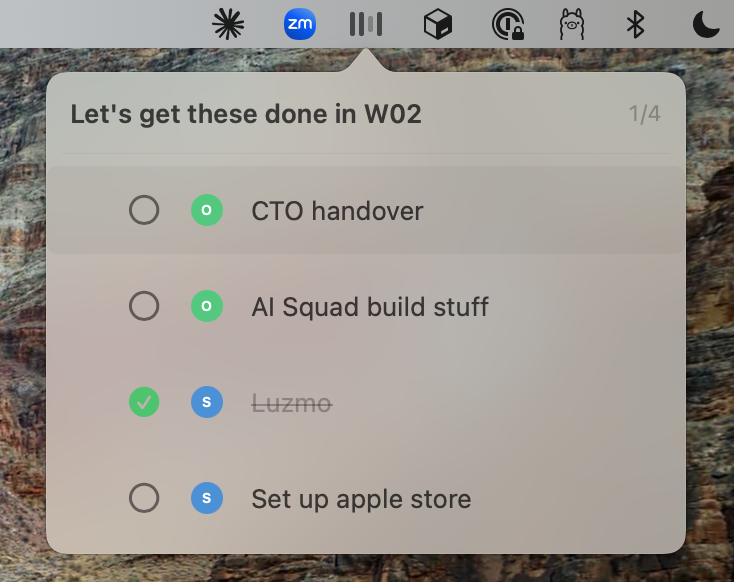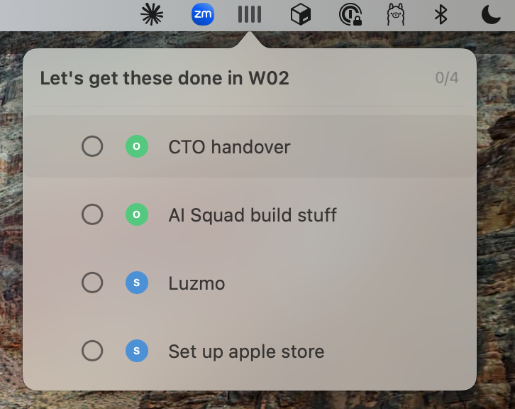 One thing I’ve wanted to try for a long time is creating a native macOS app. The learning curve had stopped me until Claude took it away. Every Monday, I paste 4 Post-it notes on my monitor with the “big things” I want to get done that week. Claude helped me build a menu bar app for that.