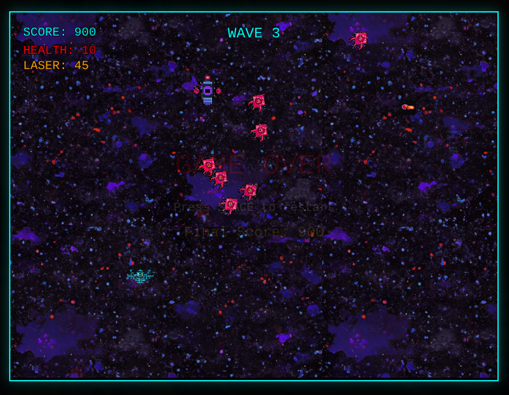 The reason is straightforward but magical: Claude used a similar prompt for each of the sprites. If I were to prompt it to “add a third type of enemy”, it would create another spaceship in the same style. It would not add a dinosaur. The game of Chinese Whispers has created some kind of Art Director. Emergent behaviour.